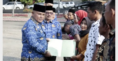 KALIANDA - Bupati Lampung Selatan (Lamsel) Nanang Ermanto menyerahkan sertifikat gratis kepada warga penerima bantuan bedah rumah program gerakan seribu rupiah (Geserbu) bekerjasama dengan Badan Pertanahan Nasional (BPN) Kabupaten Lamsel.