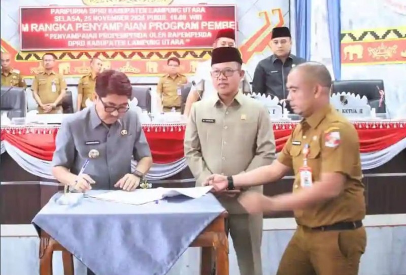 Lampung Utara, LE - Bupati Lampung Utara Dr. Ir. Hamartoni Ahadis, M.Si menghadiri Rapat Paripurna DPRD Kabupaten Lampung Utara dalam rangka pengesahan Program Pembentukan Peraturan Daerah (PROPEMPERDA) Tahun Anggaran 2026 yang dilanjutkan dengan pengesahan Rancangan Nota Keuangan dan Raperda tentang Anggaran Pendapatan dan Belanja Daerah (APBD) Tahun Anggaran 2026. Rapat berlangsung pada 25 November 2025 di Gedung DPRD Kabupaten Lampung Utara bersama jajaran Forkopimda.
