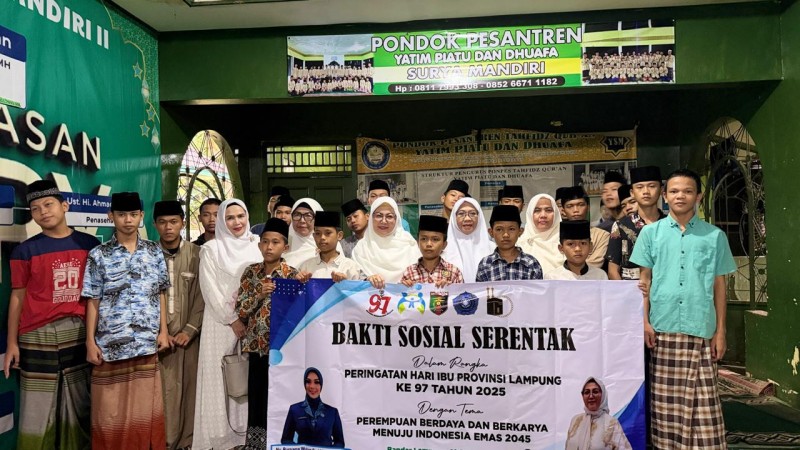 BANDAR LAMPUNG - Rangkaian Peringatan Dewan Pimpinan Wilayah Majelis Taklim Perempuan (MTP) Ikatan Persaudaraan Haji Indonesia (IPHI) Provinsi Lampung, menggelar Bakti Sosial di Pondok Pesantren Surya Mandiri di Jalan Pagaralam (PU) Bandar Lampung, Jumat (19/12/2025).