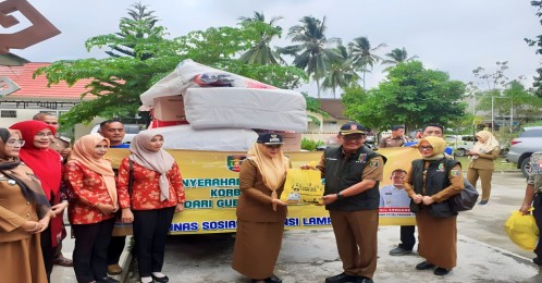 Bantuan diserahkan Kepala Dinas Sosial Provinsi Lampung Drs. Aswarodi M.Si, didampingi Kabid Linjamsos Yulya Elva A.Ks, yang diterima secara simbolis oleh Bupati Tanggamus Hj. Dewi Handajani, yang selanjutnya, akan langsung diserahkan kepada warga terdampak.