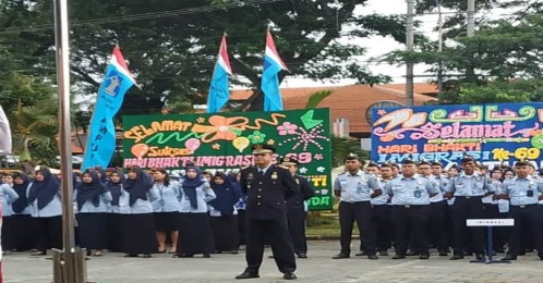 Bandarlampung, LE - Kantor Wilayah (Kanwil) Kemenkumham Lampung menggelar upacara peringatan puncak Hari Bakti Imigrasi ke-69 tahun 2019 di halaman kantor setempat, Senin (28/1/2019).
