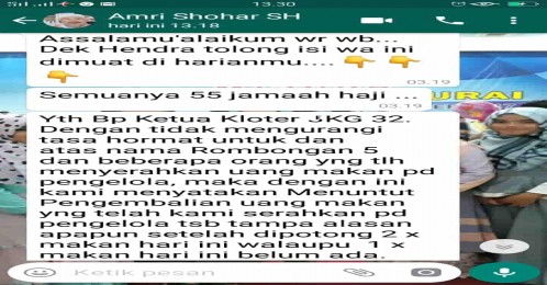 Berkenaan dengan itu beberapa jemaah yang dananya dihimpun oleh pengelola tersebut banyak yang kelaparan dan nyaris pingsan. "Lucunya malah pengurus kloter selalu bilang sabar bila jemaah mempertanyakan ketersediaan nasi itu. Jelasnya kami minta uang kami dikembalikan agar hal ini tidak menimbulkan fitnah, ini surat elektronik saya yang saya kirimkan ke kloter Ketua JKG 32," terang Amri. Baca juga: Parosil Buka Kemah Kebangsaan Pramuka