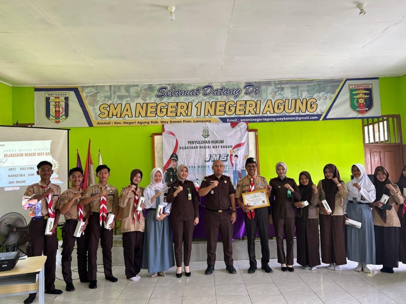 Kejaksaan Negeri (Kejari) Way Kanan kembali mengintensifkan edukasi hukum bagi generasi muda melalui program Jaksa Masuk Sekolah (JMS). Kali ini, kegiatan digelar di SMA Negeri 1 Negeri Agung, dengan mengusung tema “Anti Bullying, Jauhi Narkotika, Hindari Judi Online”. (23/09/2025)