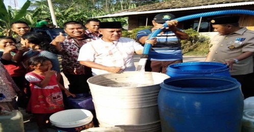 Kalianda, LE – Plt. Bupati Lampung Selatan Nanang Ermanto menyalurkan bantuan air bersih kepada warga Desa Klawi, Kecamatan Bakauheni, Minggu (9/9/2018) petang.
