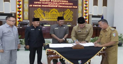 Pringsewu, LE - Perubahan Kebijakan Umum APBD serta Prioritas dan Platform Anggaran Sementara (KUA-PPAS) Kabupaten Pringsewu 2018 akhirnya disetujui dan ditandatangani bersama antara Pemkab dan DPRD setempat melalui rapat paripurna, Senin (10/9)/2018).