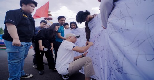 Bandar Lampung - 21 November 2024 - Calon Gubernur Lampung, Rahmat Mirzani Djausal, hadir dalam kegiatan Kampanye Tolak Politik Uang yang diselenggarakan oleh Liga Mahasiswa Nasional untuk Demokrasi (LMND) Lampung di Tugu Adipura, Bandar Lampung, hari ini. Dalam acara ini, Mirza secara simbolis menandatangani pakta integritas sebagai bentuk komitmen untuk memerangi politik uang yang dianggapnya sebagai ancaman terbesar bagi demokrasi.