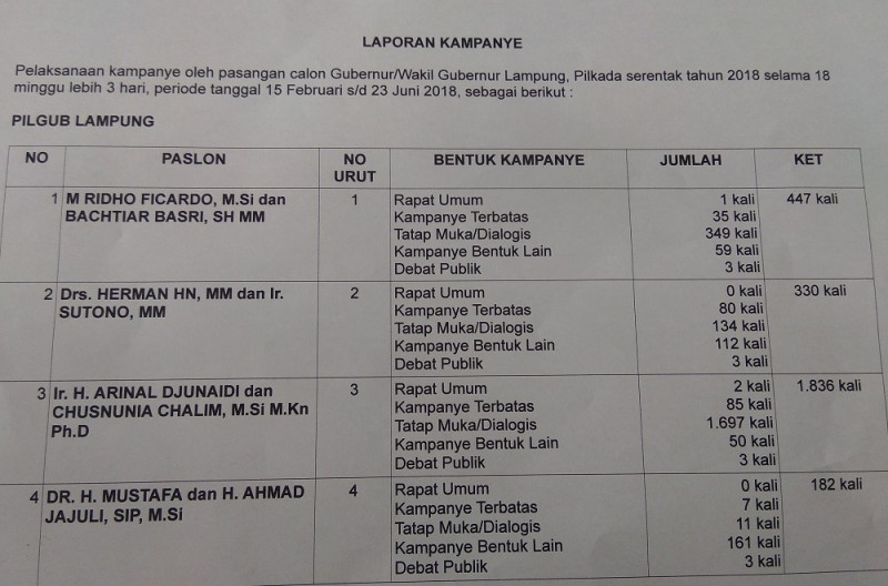 Dalam laporan dana kampanye yang disampaikan paslon 3 tercatat melakukan kampanye sebanyak 1.836 kali dengan rincian rapat umum 2 kali, kampanye terbatas 85 kali, tatap muka/dialogis sebanyak 1.697 kali, kampanye bentuk lain 50 kali dan debat publik 3 kali. Seluruh kegiatan tersebut dilaporkan hanya menghabiskan dana Rp9.084 miliar. Baca juga: Lampung Selatan Masuk Tiga Besar Terbaik se-Lampung