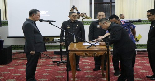 Bandarlampung, LE - Gubernur Lampung diwakili Sekretaris Daerah Provinsi Lampung, Fahrizal Darminto, melantik dan mengambil sumpah jabatan dua Pejabat Eselon II, di Ruang Abung Balai Keratun, Jumat (16/12/22).