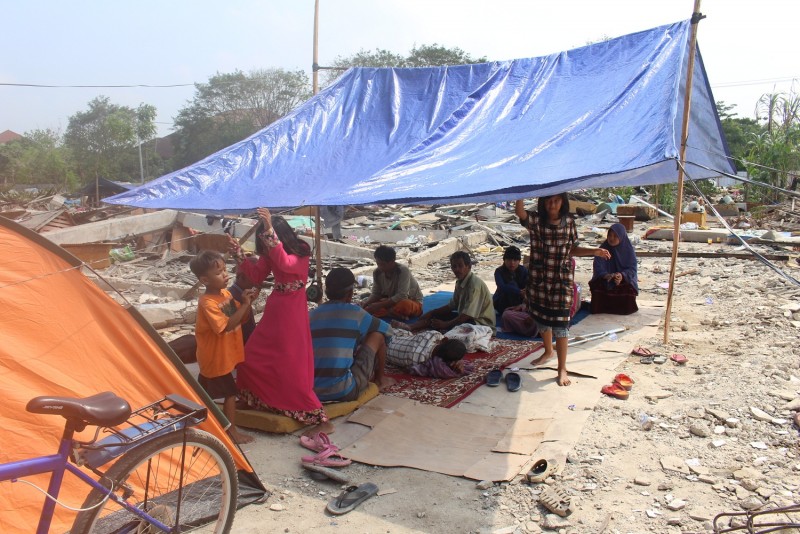Tenda yang didirikan para warga terlihat sangat sederhana, dengan beratap terpal using dan beralaskan kardus bekas.
